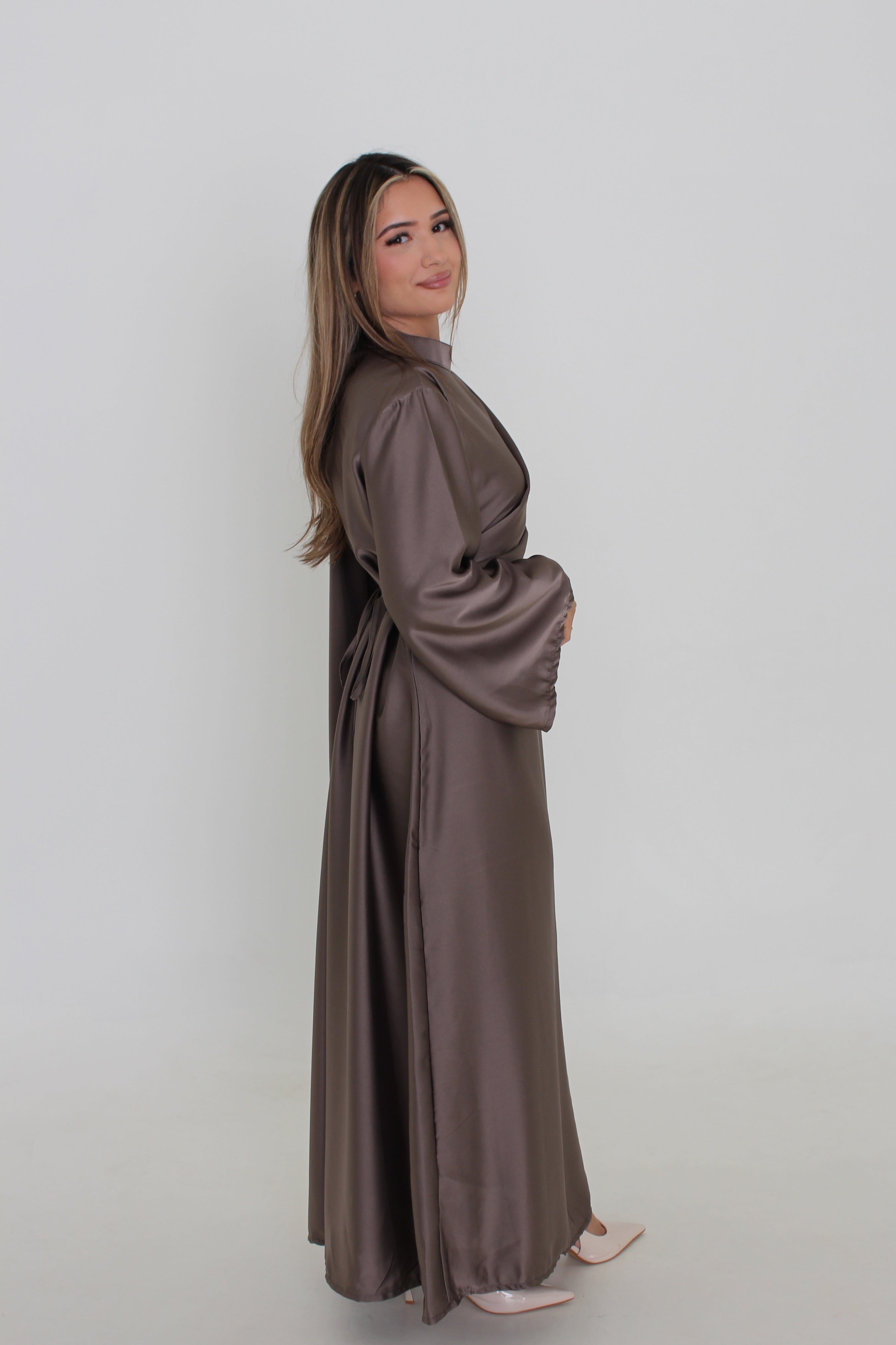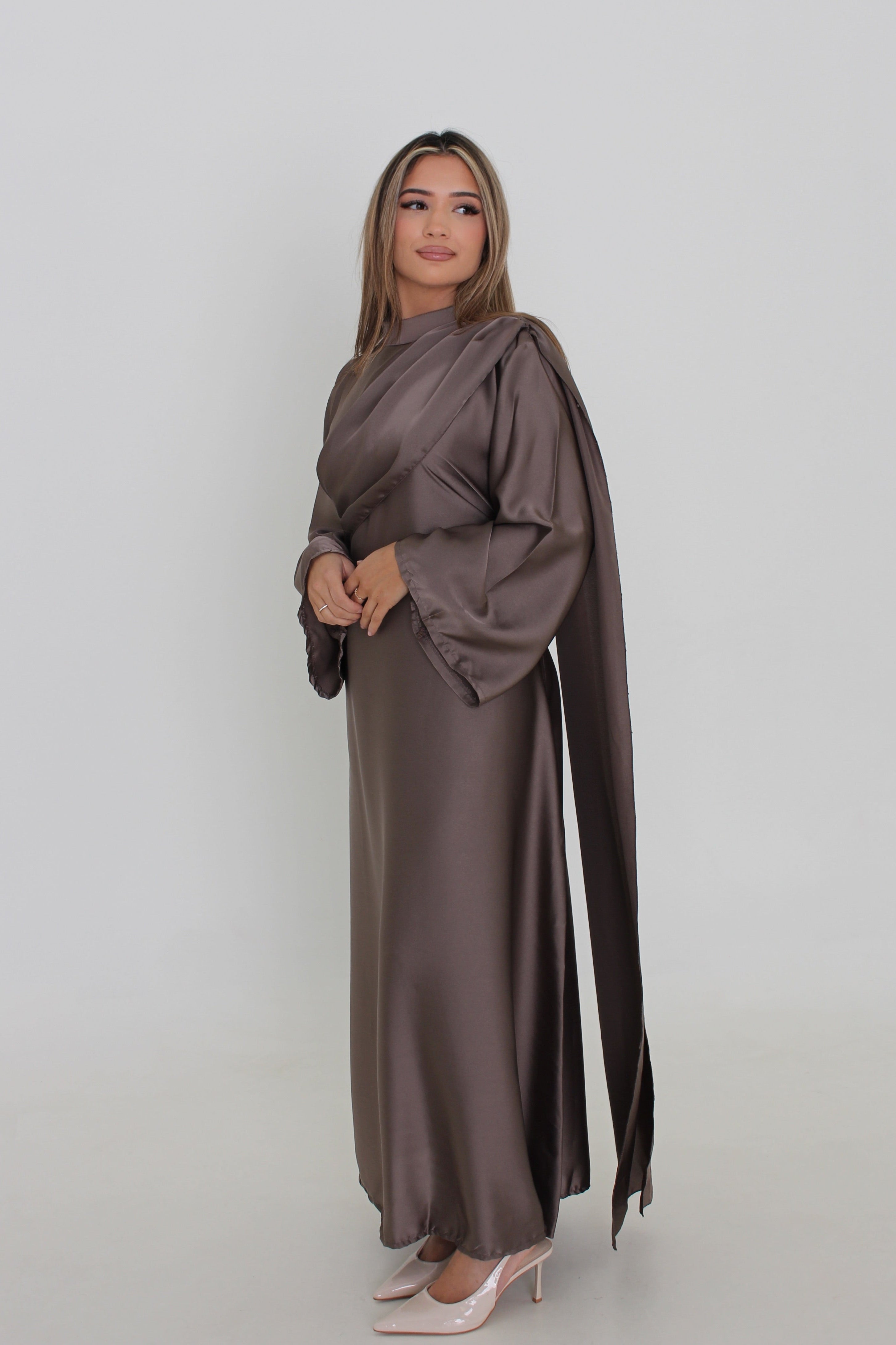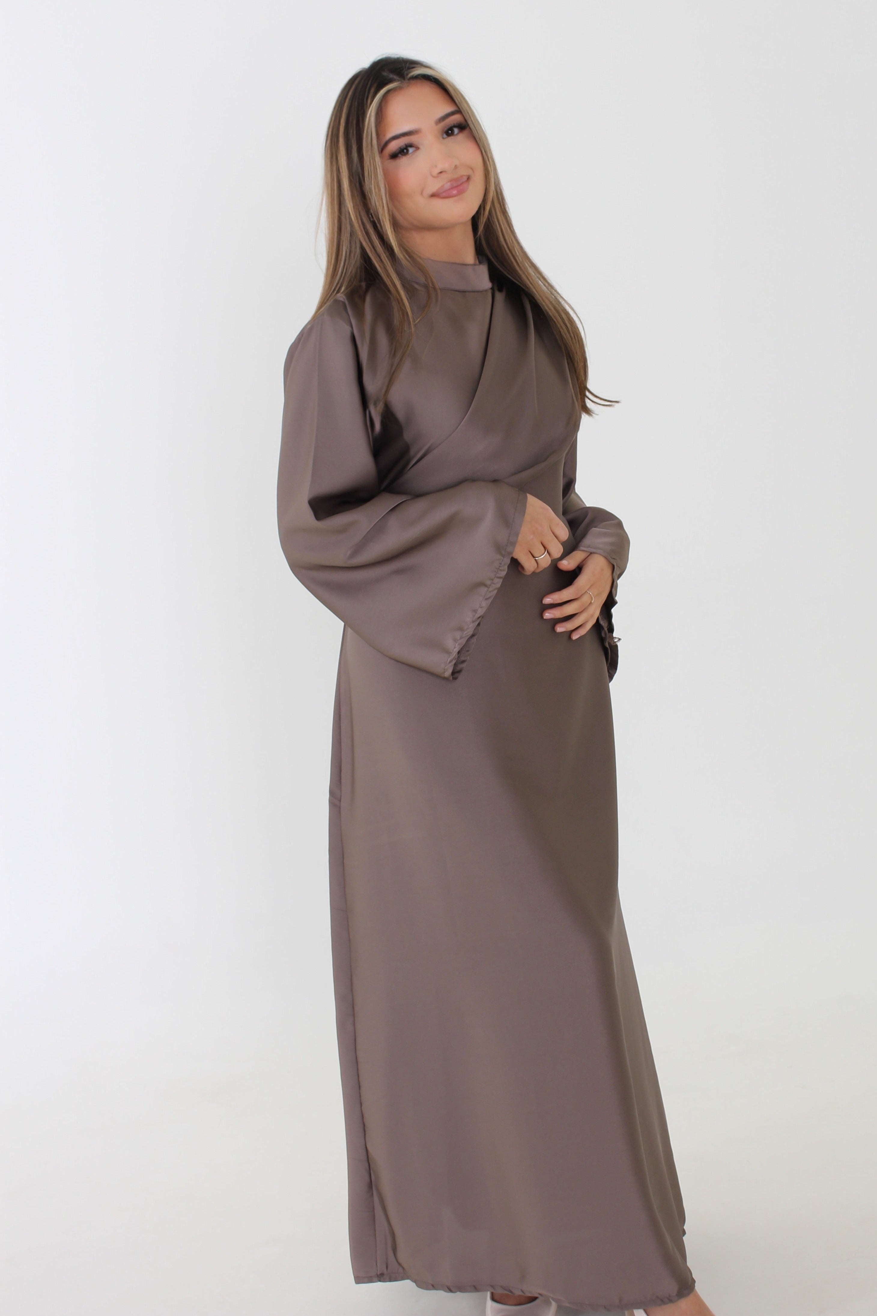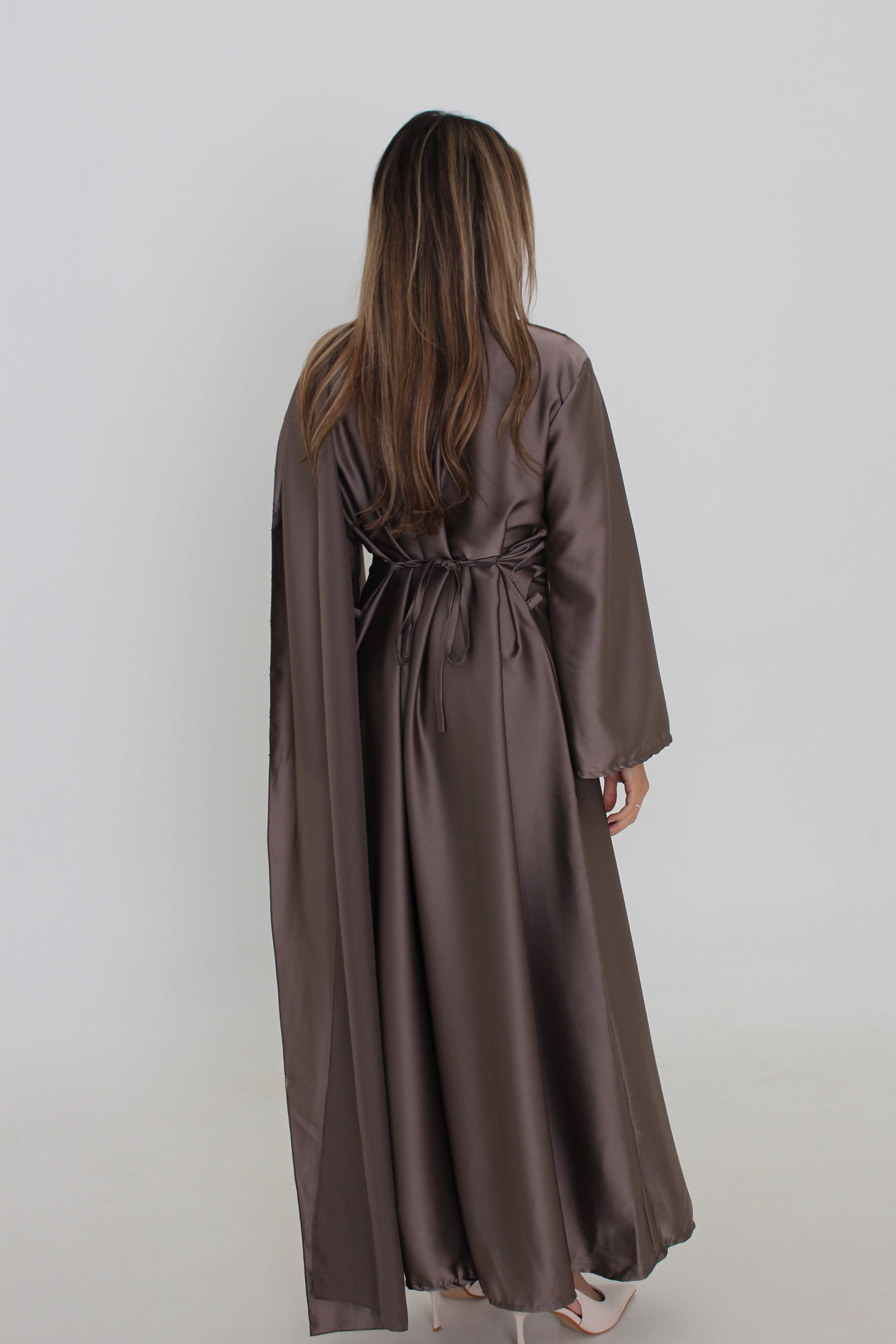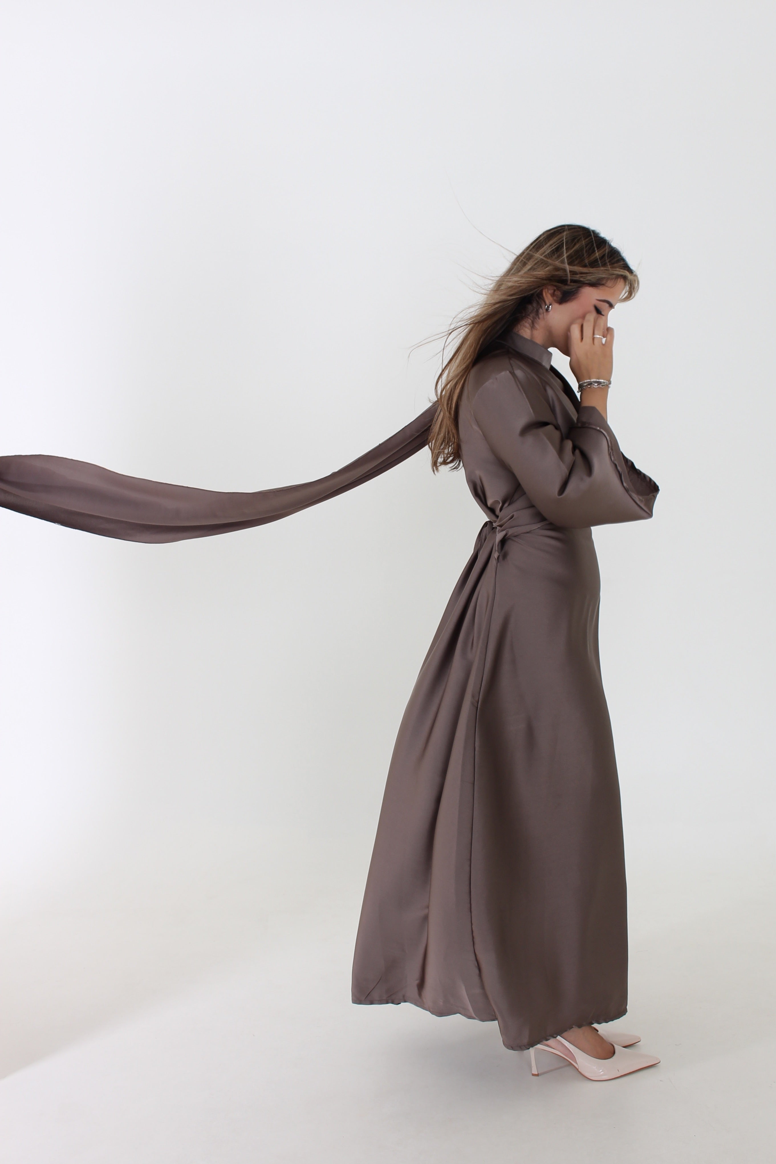 Deze schattige taupe abaya petite is je nieuwe favoriete stuk! Met de handige centuur kun je de pasvorm aan de achterkant precies naar je wens aanpassen – zo zit het altijd perfect. En die heerlijke glimmende stof? Die geeft je look net dat extra sprankeltje. Gewoon adorable!