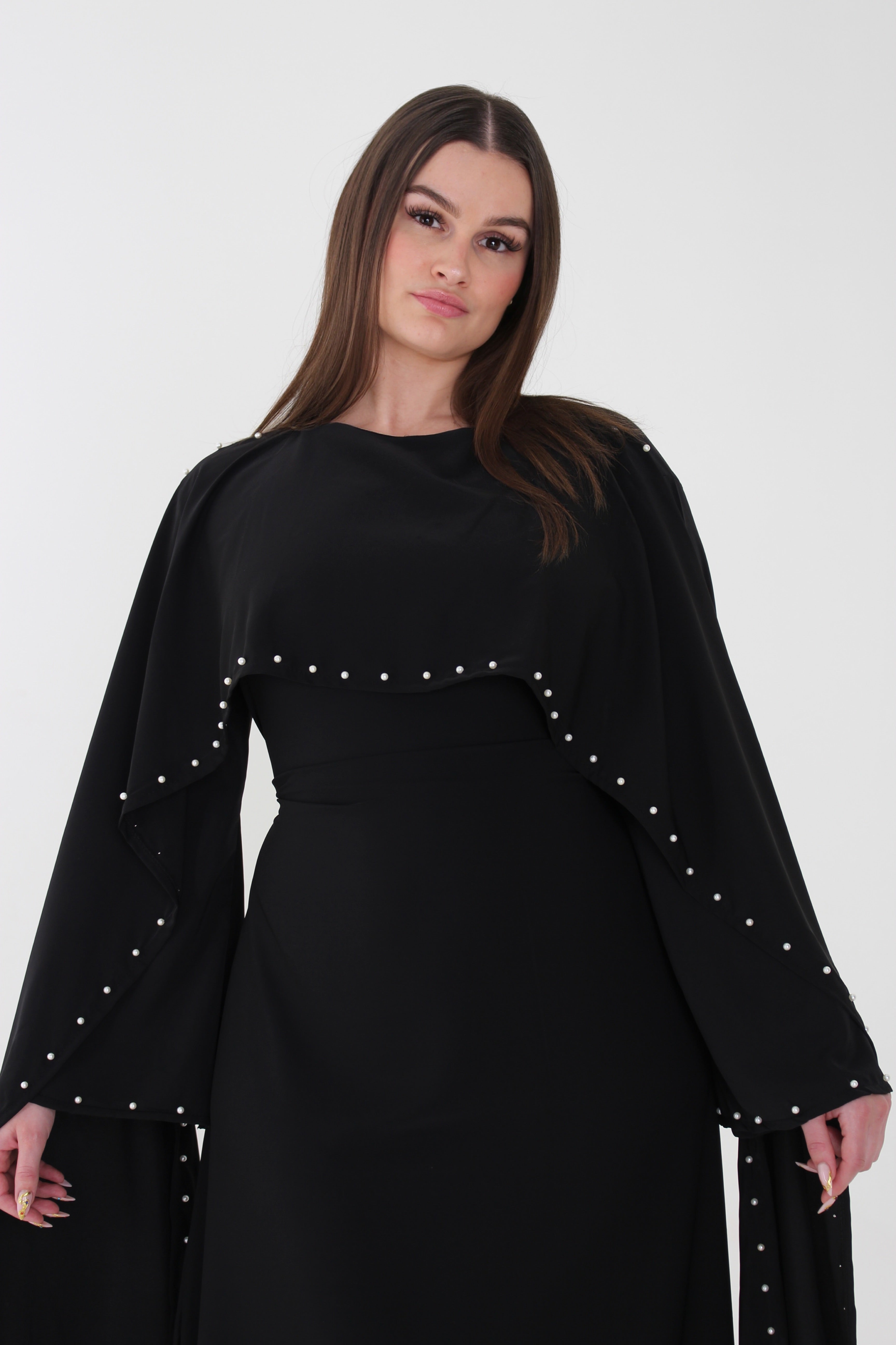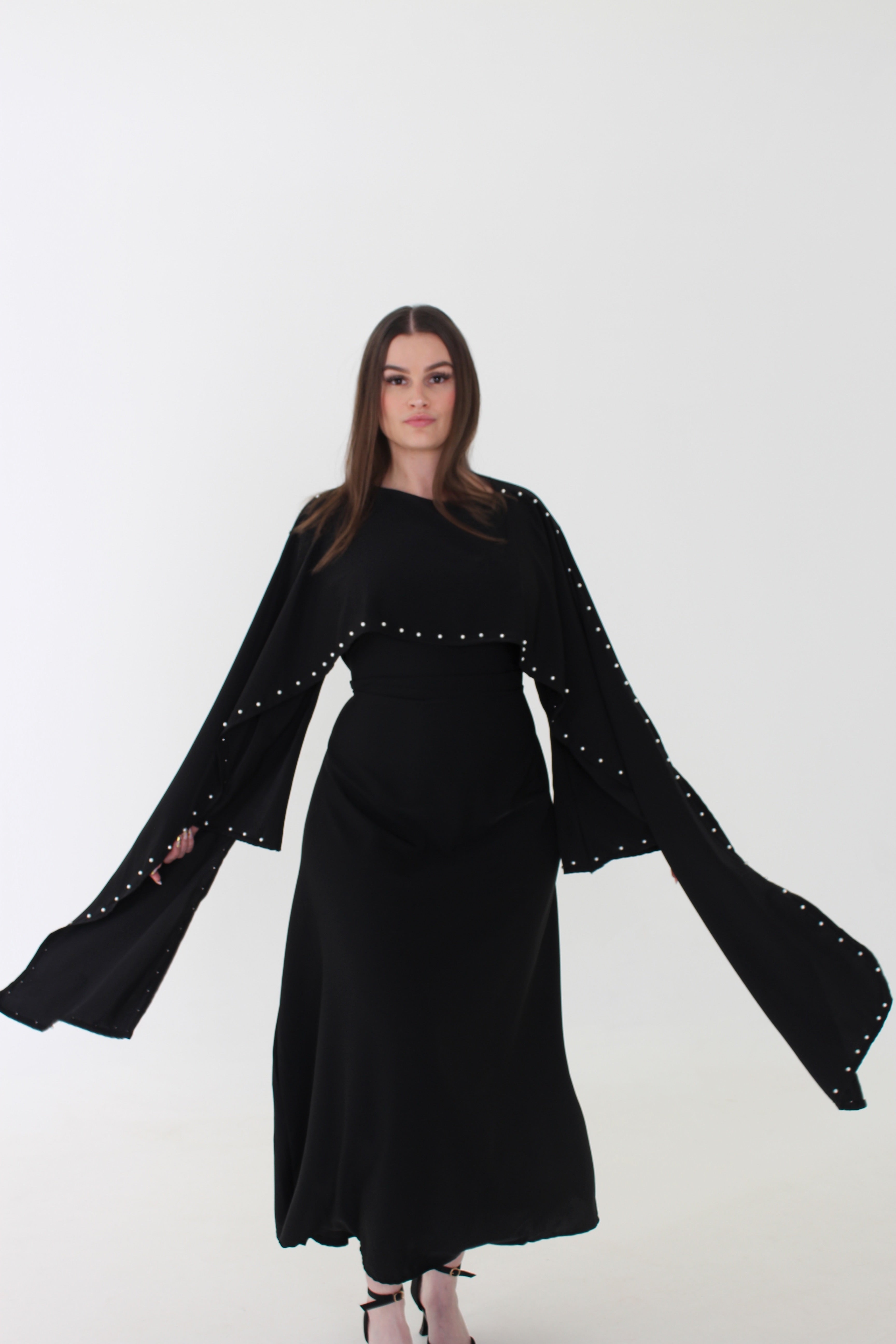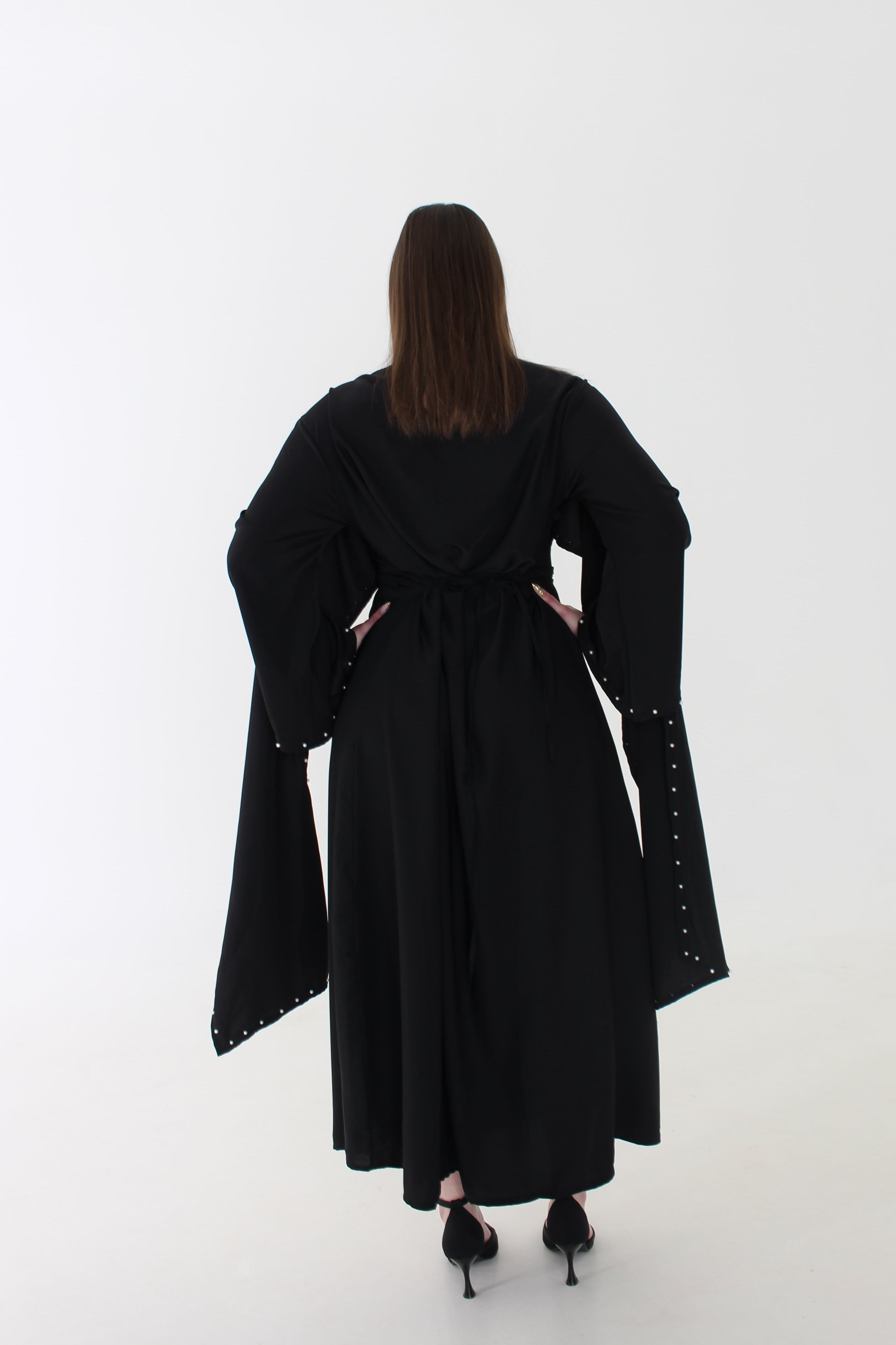 De abaya is afgewerkt met subtiele pareldetails langs de mouwen en het bovenstuk, wat zorgt voor een verfijnde en luxe uitstraling. De vloeiende stof beweegt prachtig mee en maakt dit item ideaal voor zowel Ramadan, iftars als speciale gelegenheden.