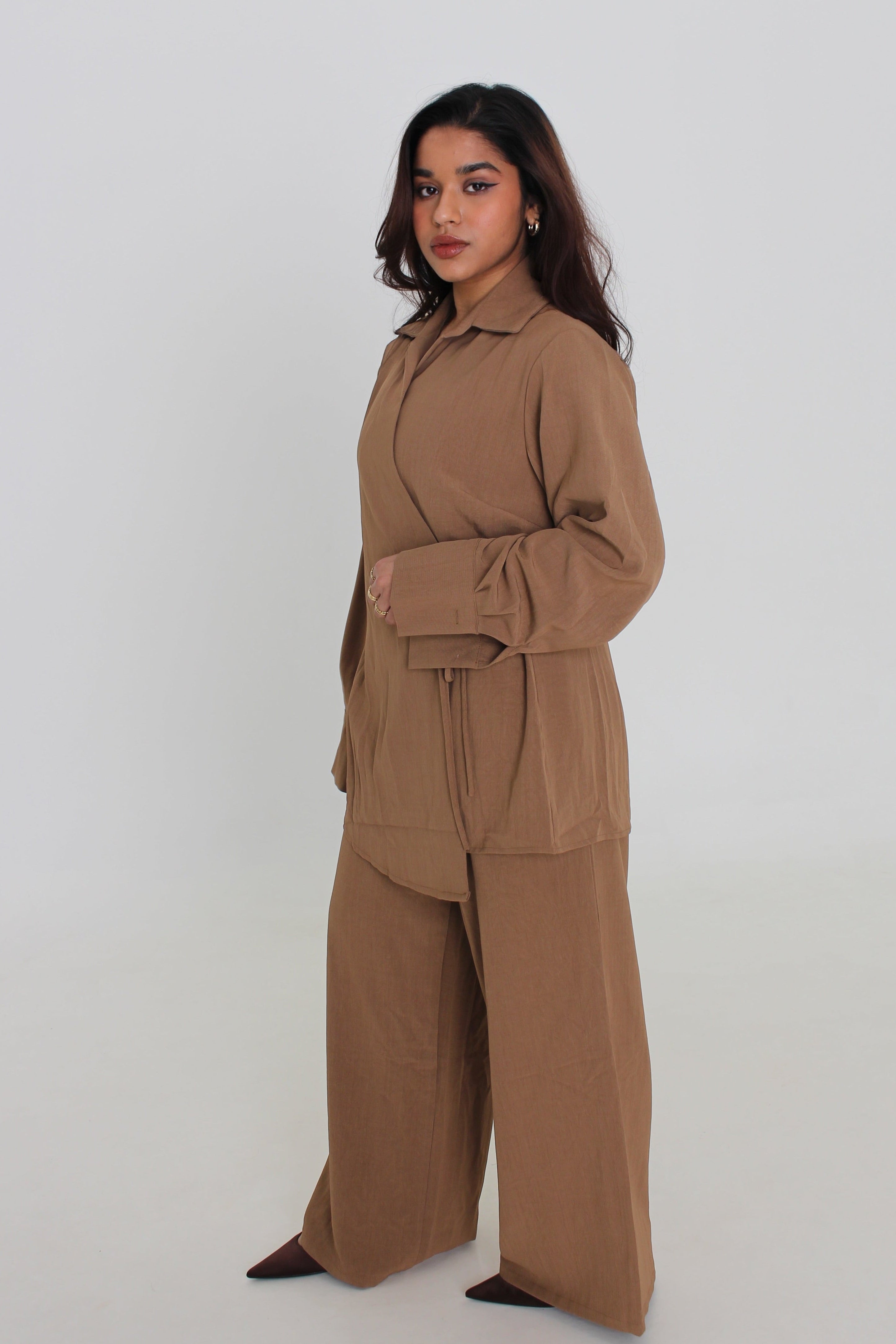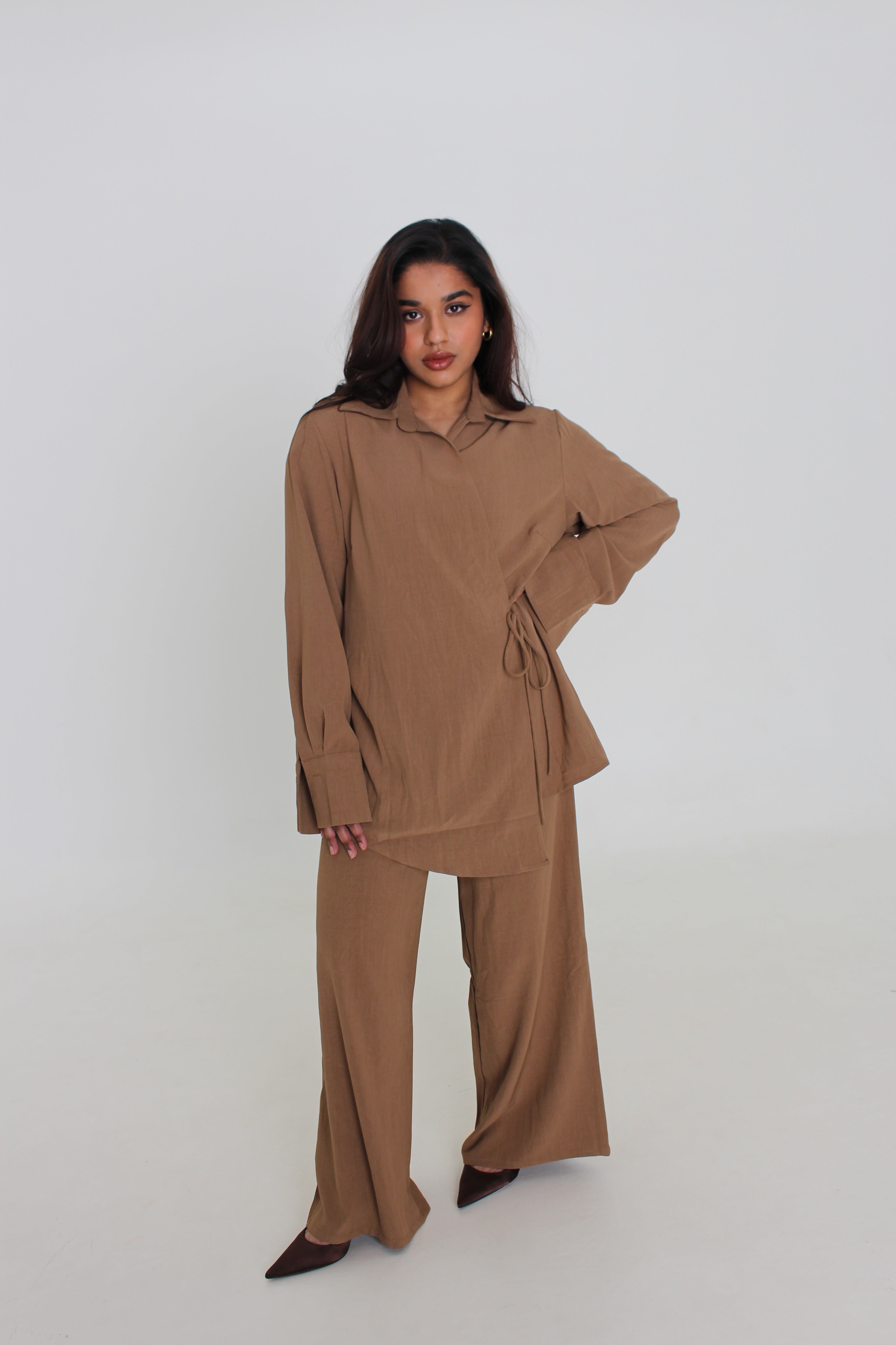 De Soraya Set in Taupe is de perfecte mix van elegantie en comfort. Deze stijlvolle two-piece set bestaat uit een soepelvallende top met strikdetail aan de zijkant en een bijpassende broek met een fijne, flatterende pasvorm. De subtiele olivekleur geeft de set een rustige, luxe uitstraling en is makkelijk te combineren voor zowel dagelijks gebruik als speciale gelegenheden.