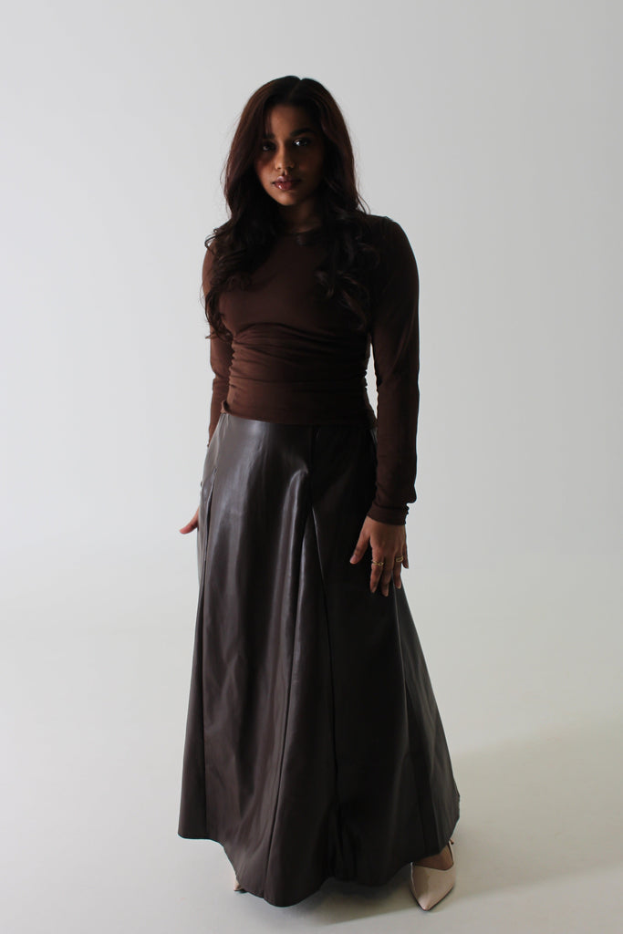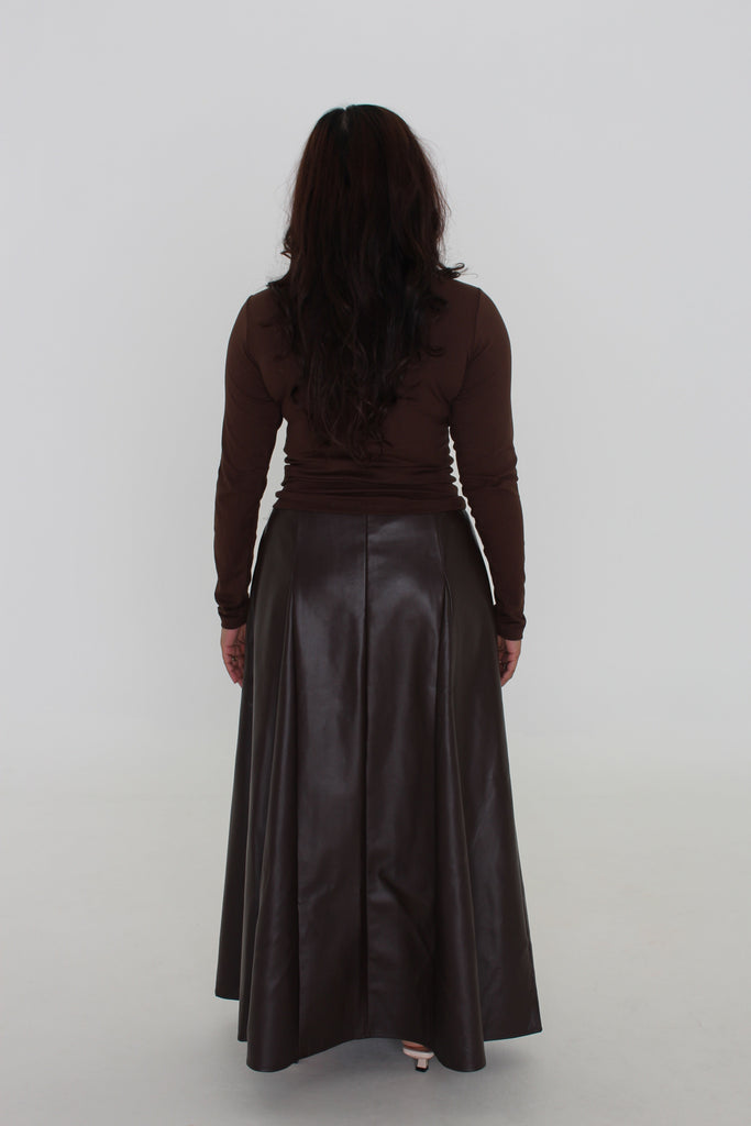 Onze Espresso Skirt geeft elke outfit instant luxe. De diepe koffietint en subtiele glans zorgen voor een chique, modest look met een touch of edge. Flowy en super comfortabel perfect om eindeloos te combineren.