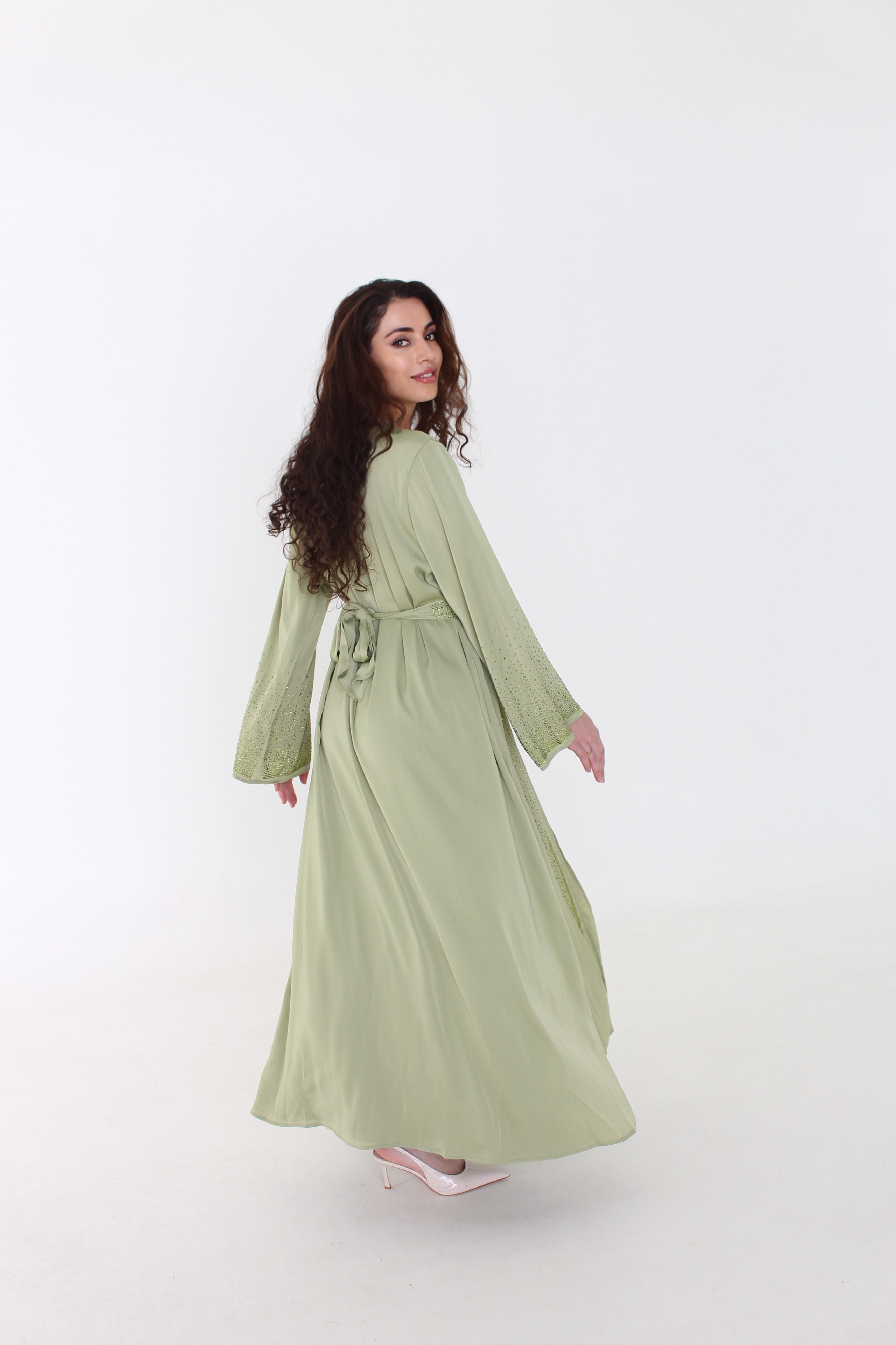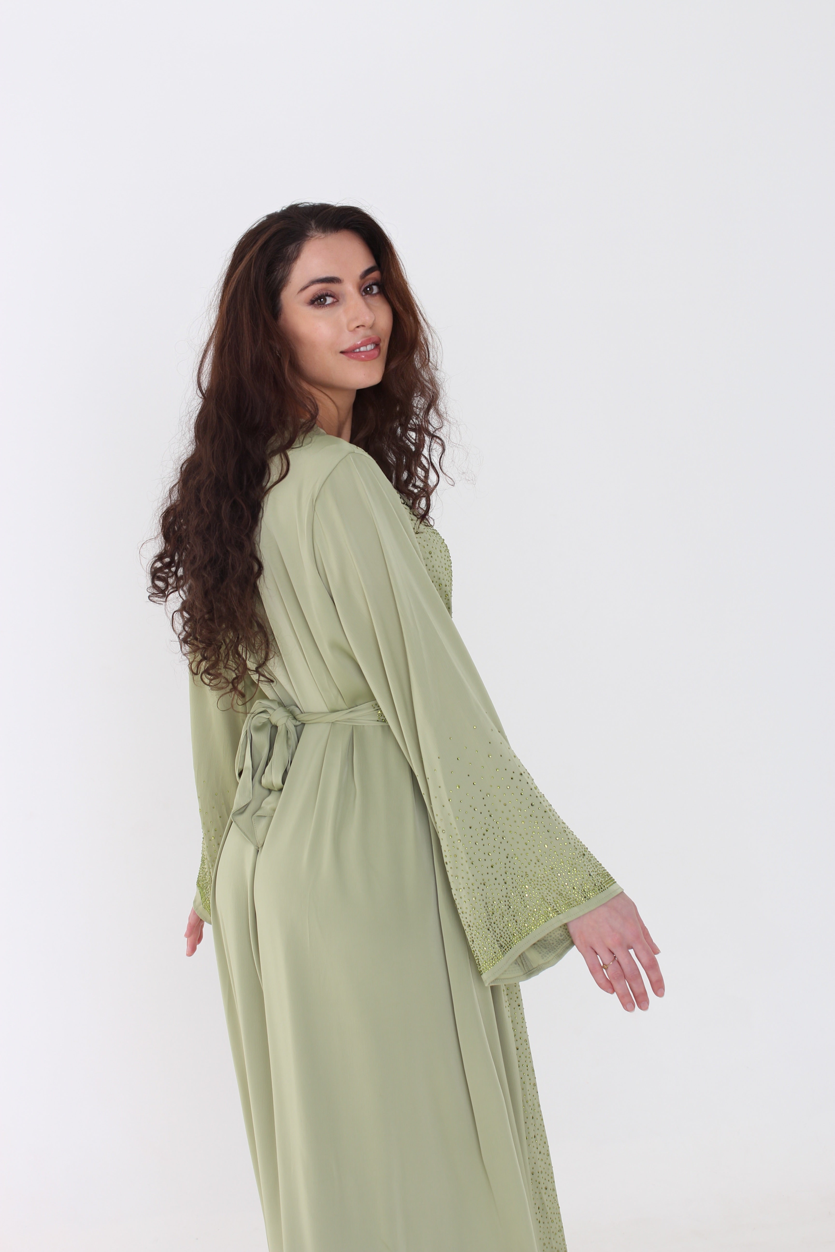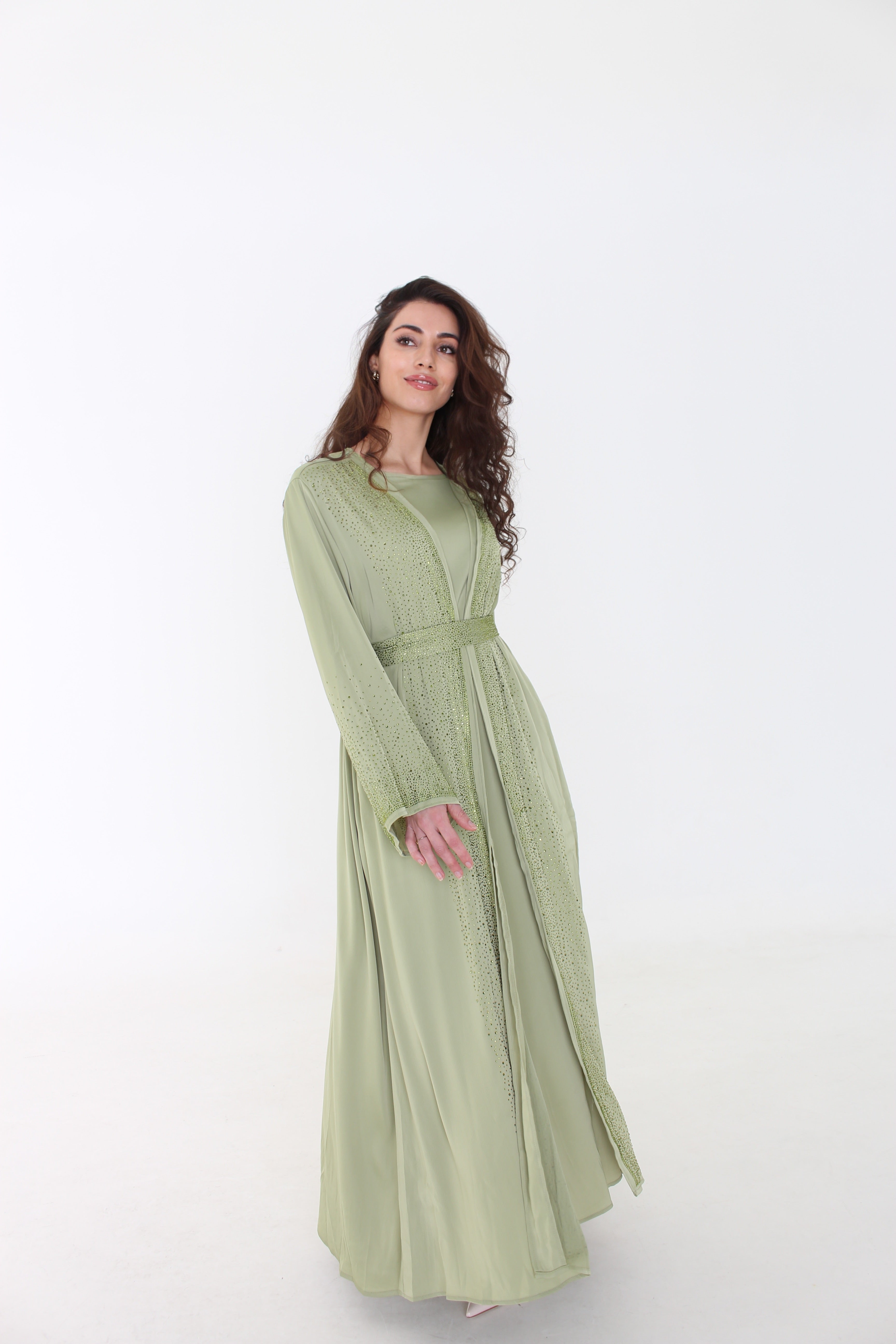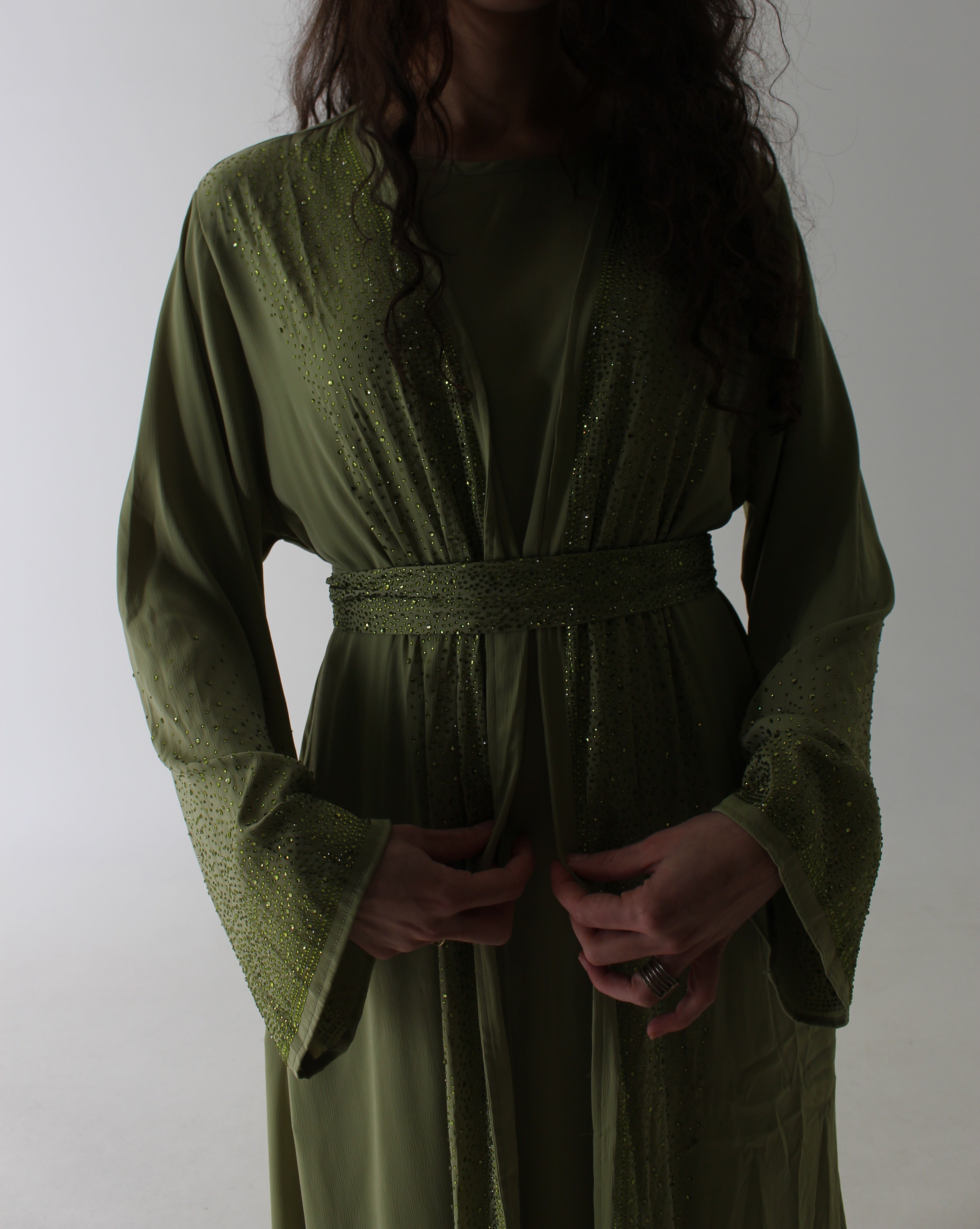 Deze olive abaya set is echt alles wat je nodig hebt, een echte eyecatcher. Met schitterende steendetails die het licht perfect vangen, geef je jezelf die Main character-energie voor Eid, bruiloften of elk moment waarop je wat meer wilt opvallen. De naam "Diva" zegt het al: stijlvol, glamoureus en volledig jezelf. Een exclusief stuk dat jouw persoonlijkheid uitstraalt.
