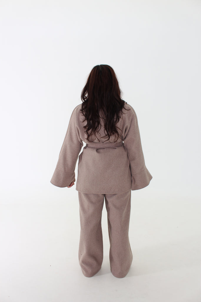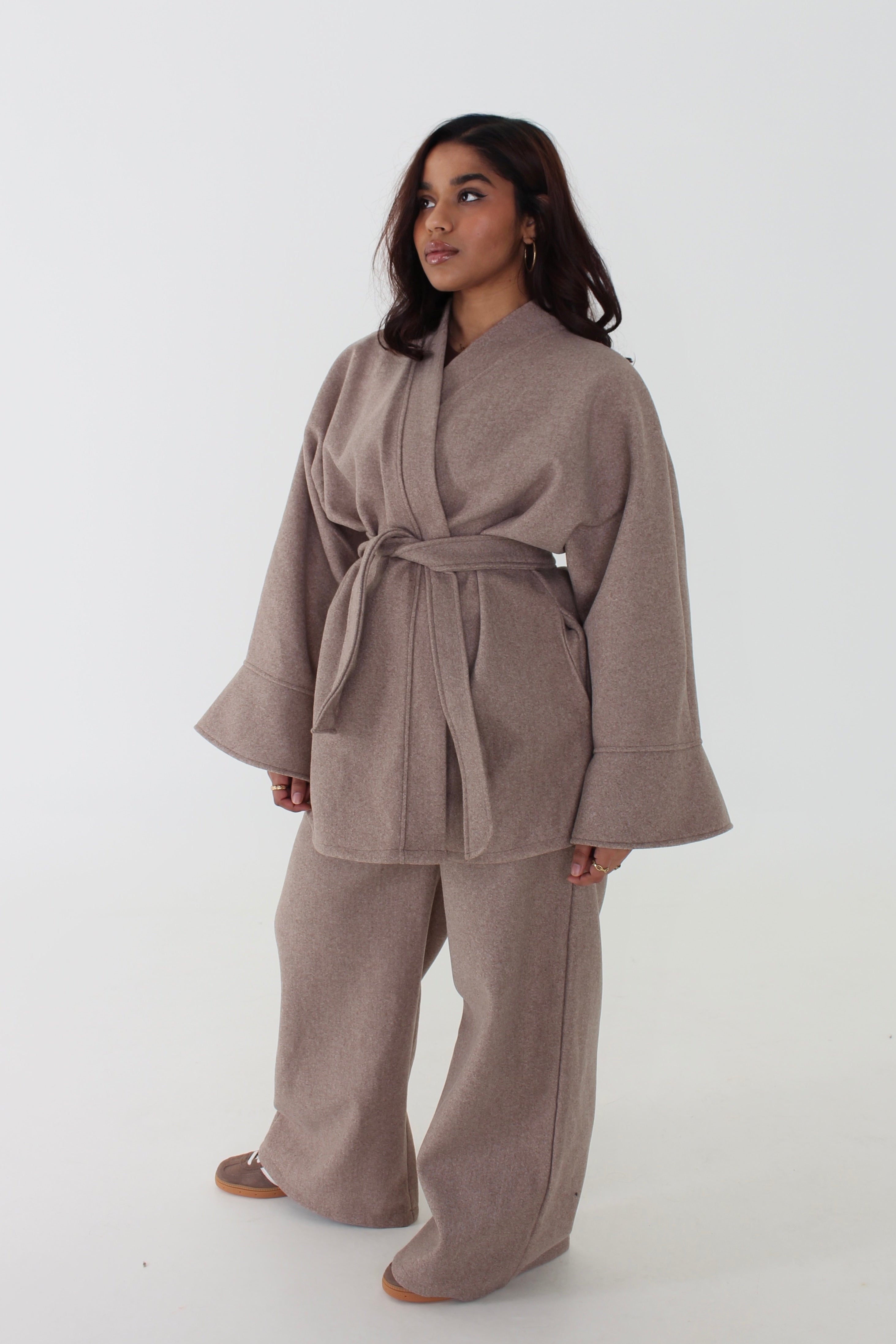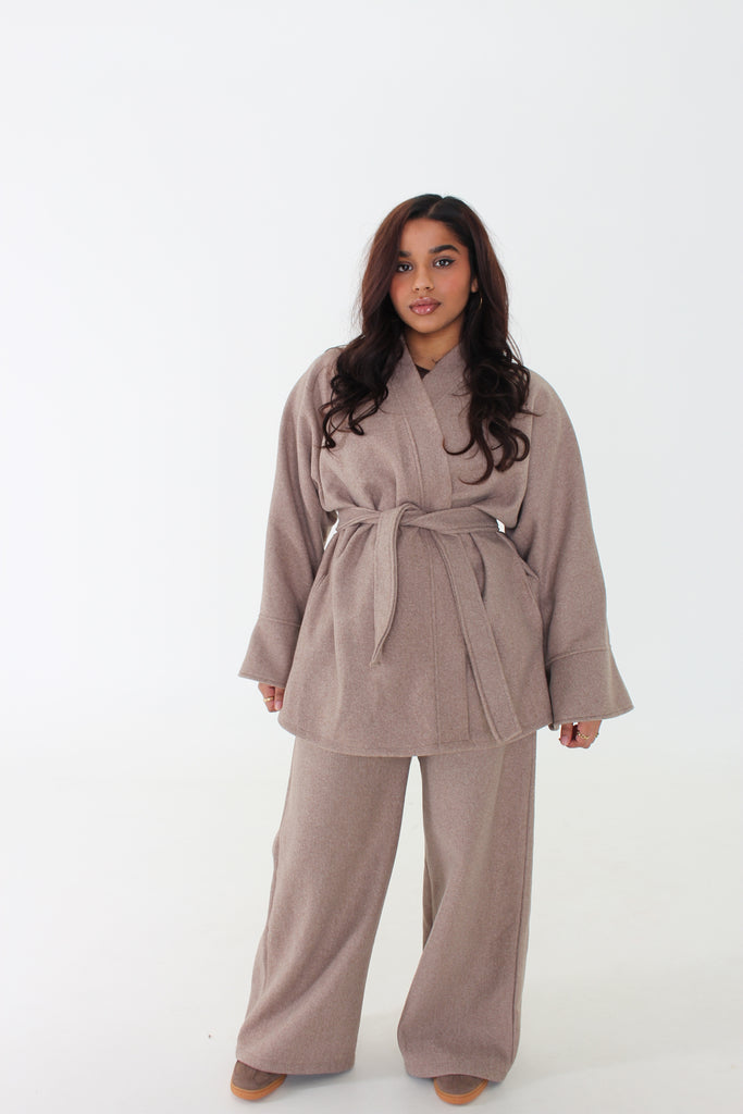 Onze Kyomi set is gemaakt van een heerlijke, dikke stof die je warm houdt tijdens de koudere dagen. De kimono-style top met strikceintuur creëert een mooie, vrouwelijke shape, terwijl de wide-leg pants zorgen voor een elegante, comfortabele fit.