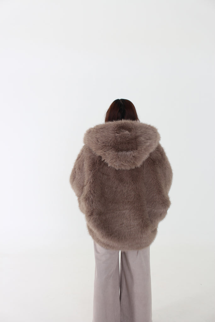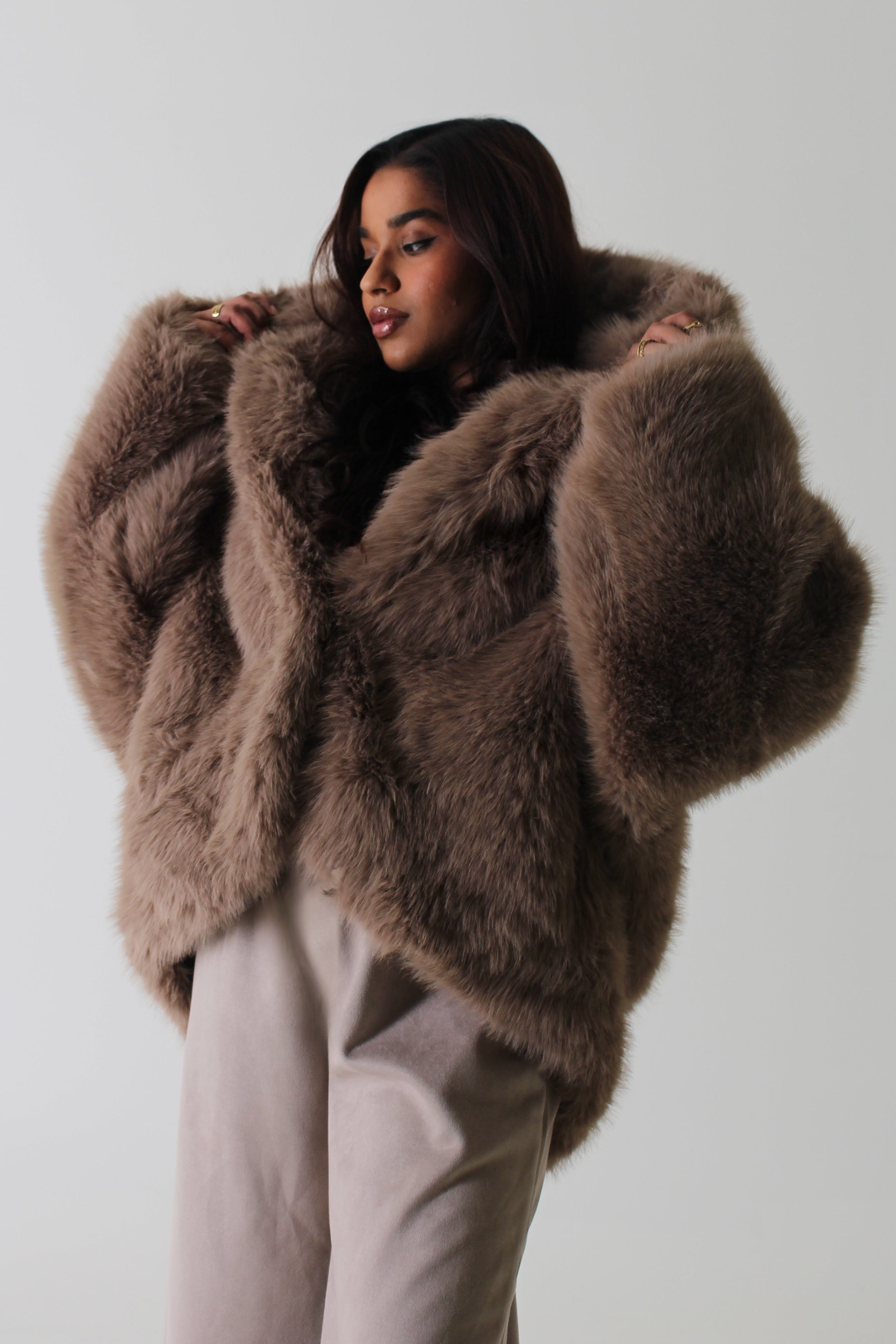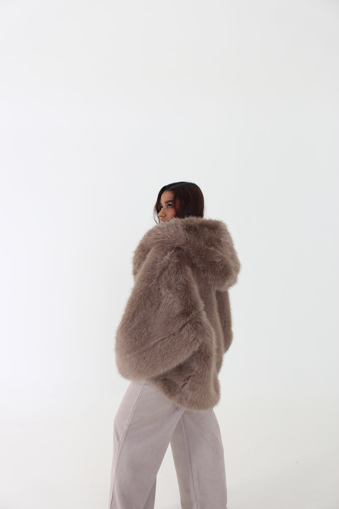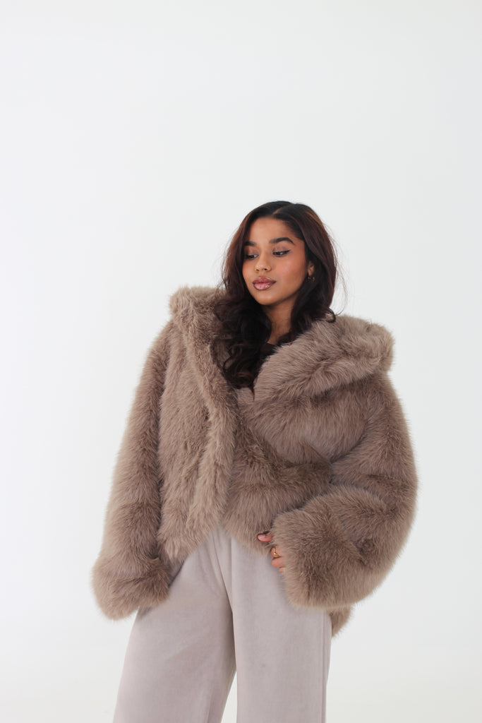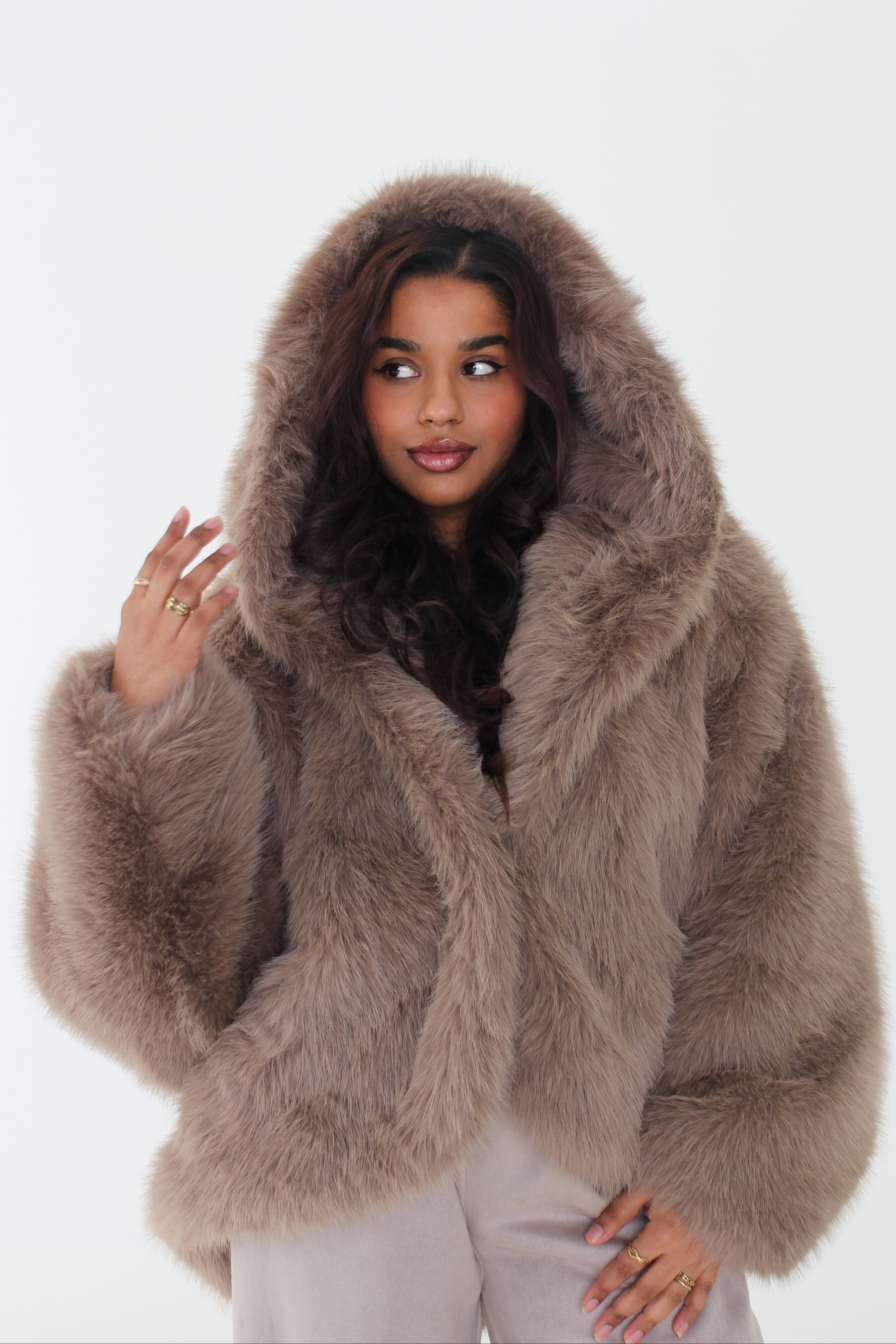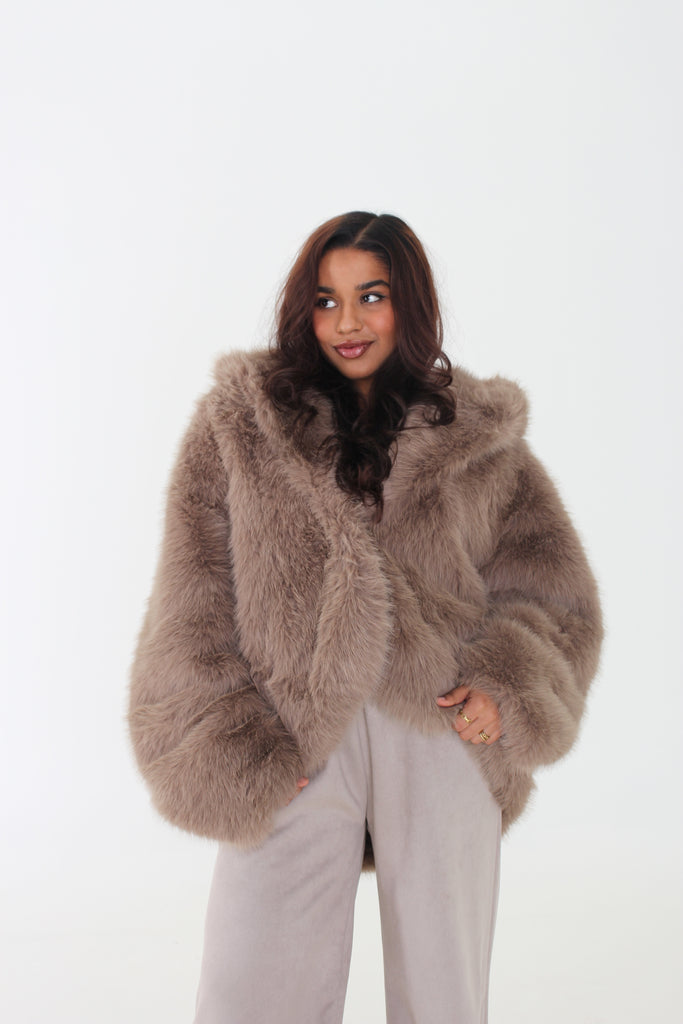 De Baddie is dé statement coat die elke outfit naar een hoger niveau tilt. Een luxe faux fur in een prachtige warme nude-taupe tint, perfect fluffy, zacht én heerlijk warm.