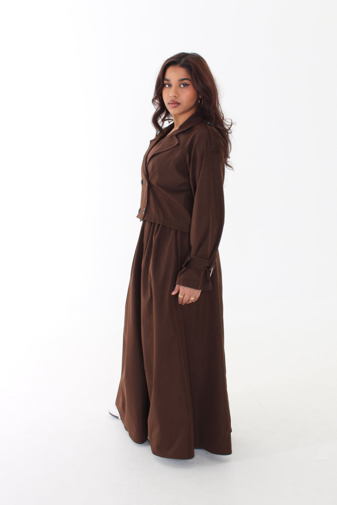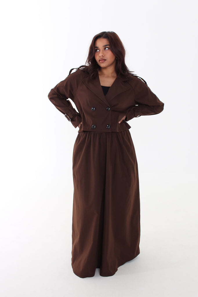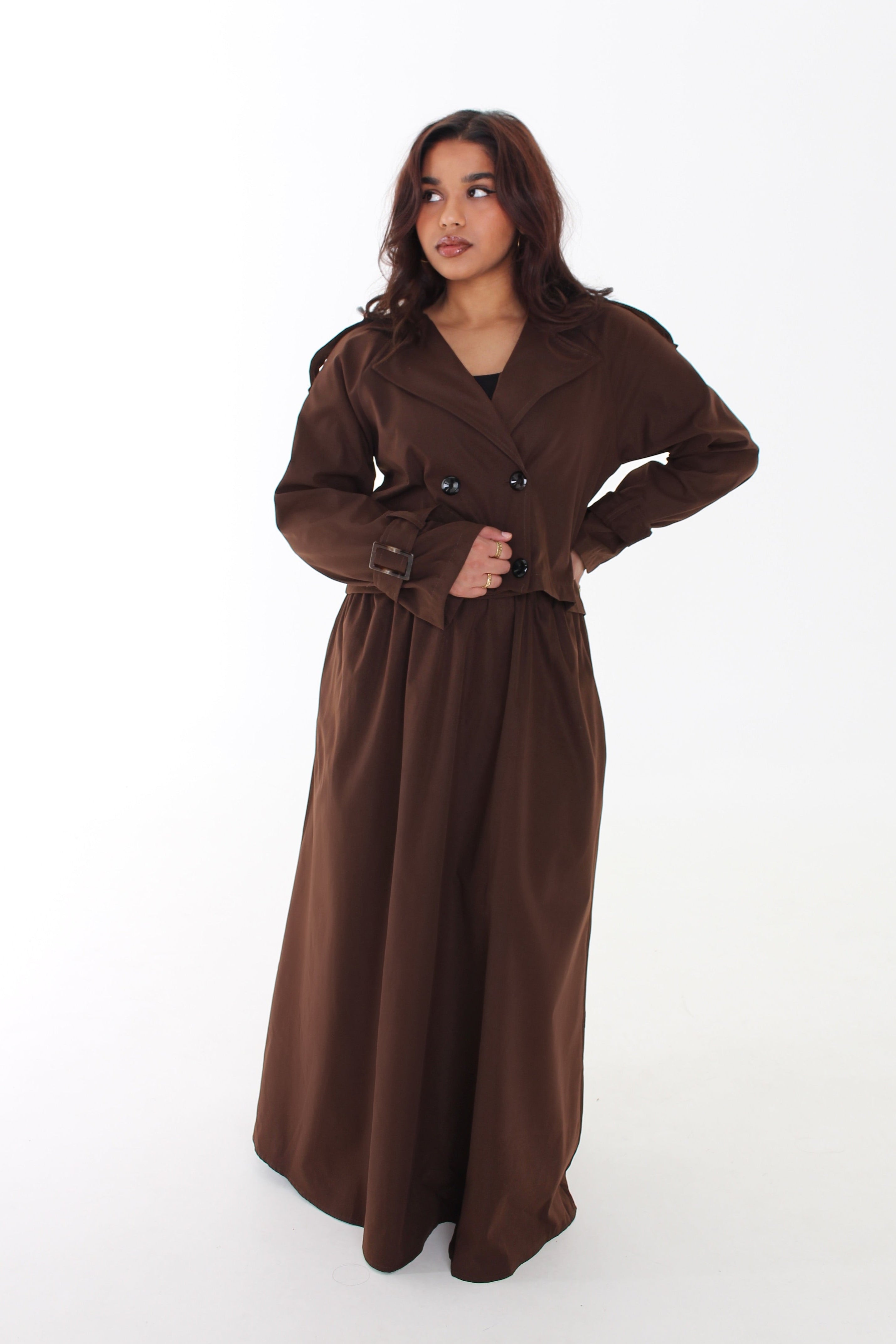 Maak kennis met onze Brown Trenchsuit – een eigentijdse interpretatie van een klassiek icoon. Deze set combineert de verfijnde uitstraling van een trenchcoat met het comfort en de elegantie van een bijpassende rok.