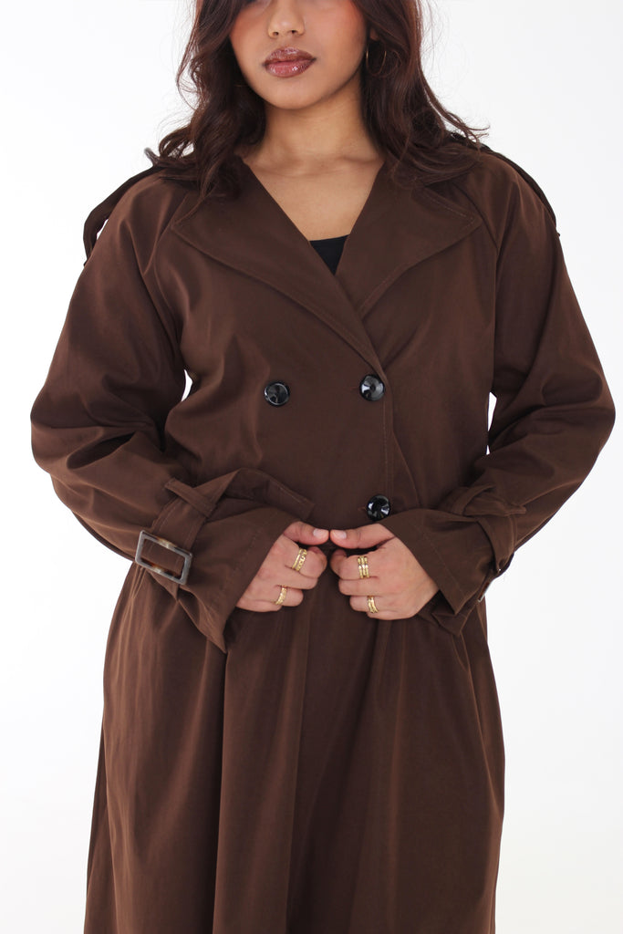 De warme, bruine tint straalt zachtheid en luxe uit, terwijl de details zoals de dubbele knopen, de kraag en de ceintuuraccenten zorgen voor een chique en krachtige look.